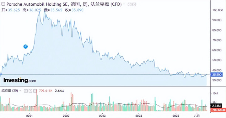 保时捷CEO迈克尔·莱特斯(Michael Leiters)在最新财报会议上坦言,公司正经历“战略调整期”的阵痛。但市场显然不给面子——财报一出,股价一度跳水,市值蒸发数十亿欧元。与2022年的高点相比,保时捷的市值已腰斩。