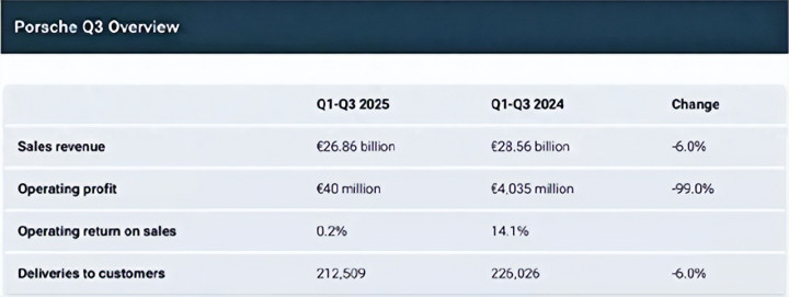 2025年前三季度,保时捷经营利润仅4000万欧元,同比暴跌99%,相比去年同期的40.35亿欧元,可谓“脚踝斩”。更严峻的是,其第三季度直接录得9.66亿欧元的运营亏损。
